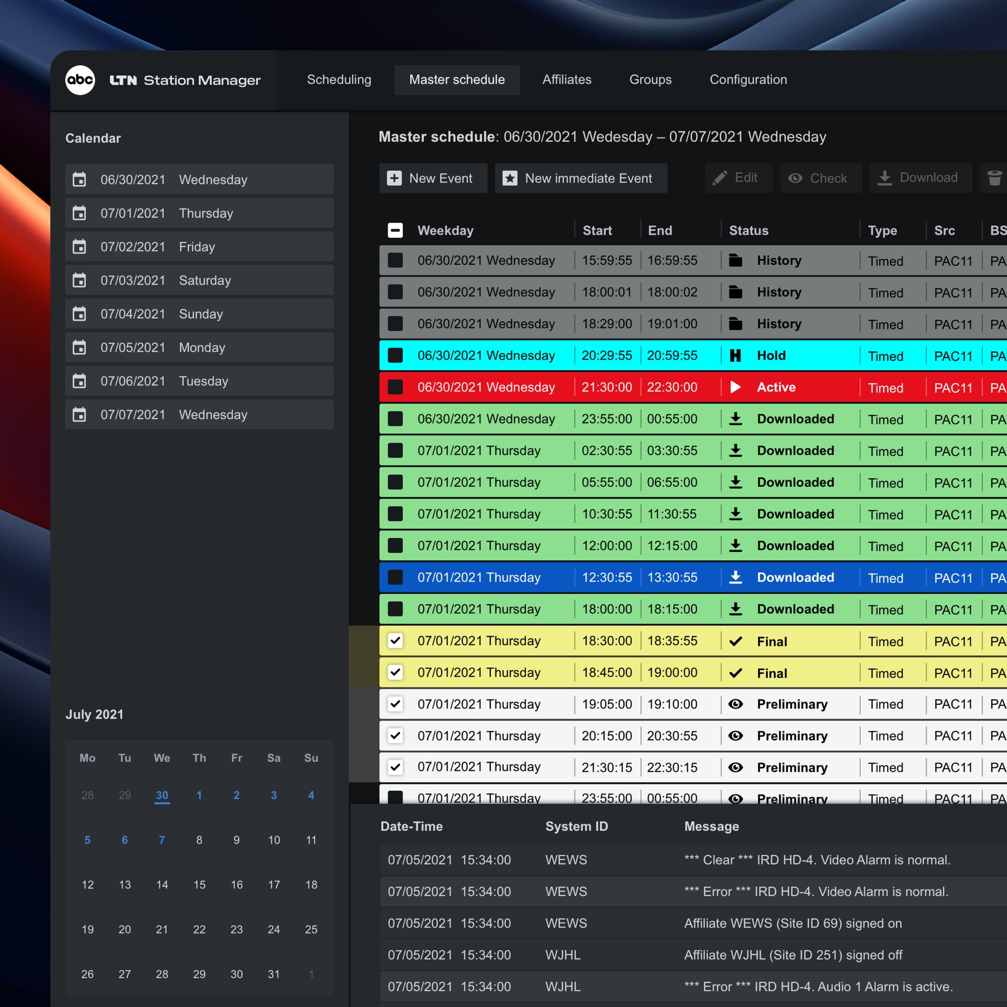LTN Station Manager (formerly Affiliate Manager) is a mission-critical monitoring, control, and automation system used by ABC network affiliates to manage live and scheduled broadcast programming.
